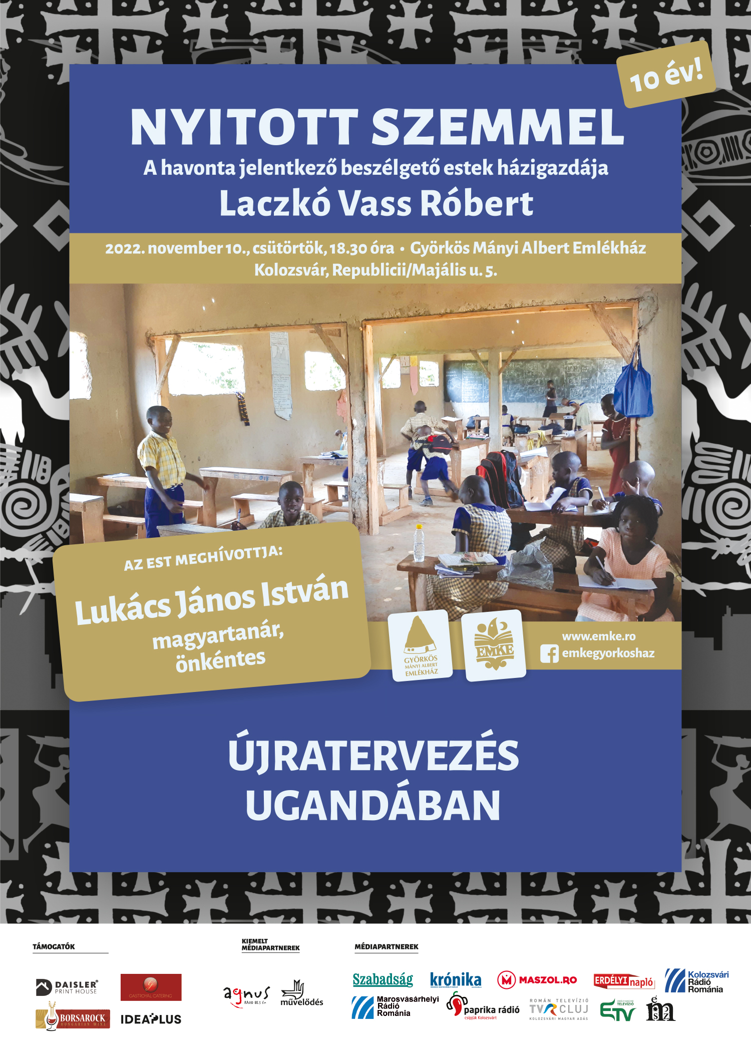 A Györkös Mányi Albert Emlékház (Kolozsvár, Republicii / Majális u. 5.) Nyitott szemmel c. világjáró sorozatának Újratervezés Ugandában című beszélgetésére 2022. november 10-én, csütörtökön, 18.30 órától kerül sor.