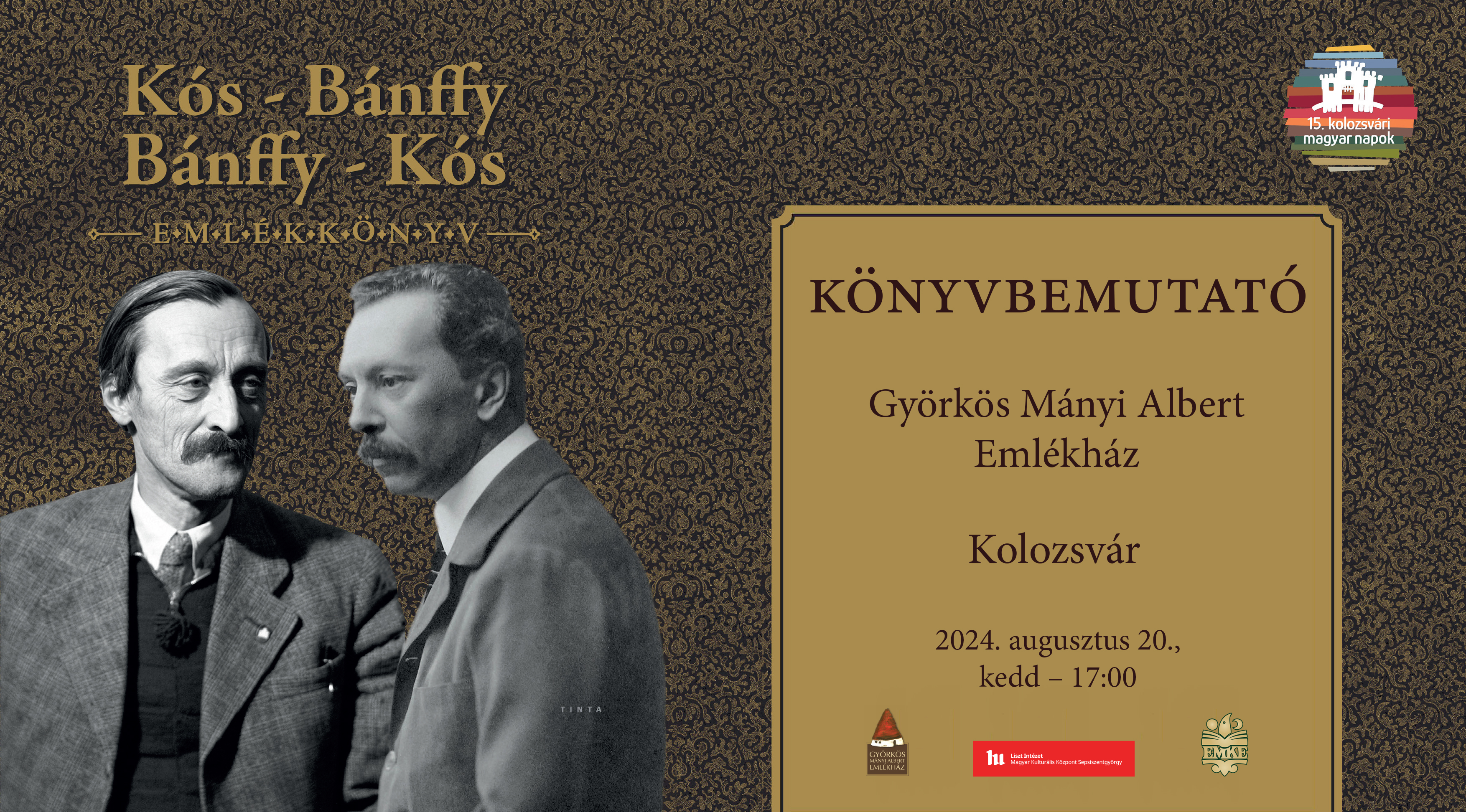 2024. augusztus 20-án, kedden, 17 órától, a 15. Kolozsvári Magyar Napok keretében, a 2023-ban, Bánffy Miklós születésének 150. és Kós Károly születésének 140. évfordulóján megjelent Kós-Bánffy, Bánffy-Kós Emlékkönyvet bemutatja Szebeni Zsuzsanna, a kötet szerkesztője, a Liszt Intézet Sepsiszentgyörgy vezetője és Gy. Dávid Gyula építész, a kötet egyik szerzője. Köszöntőt mond Kós Katalin, a Györkös Mányi Albert Emlékház vezetője, Kós Károly unokája.