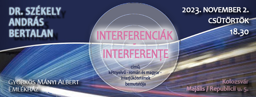 Székely András Bertalan budapesti művelődésszociológus, magyarság- és nemzetiségkutató Interferenciák – Intereferențe című kétnyelvű – magyar és román, kilenc mélyinterjút tartalmazó kötetét mutatjuk be 2023. november 2-án, csütörtökön, 18.30 órakor a Györkös Mányi Albert Emlékházban (Kolozsvár, Republicii/Majális u. 5.).