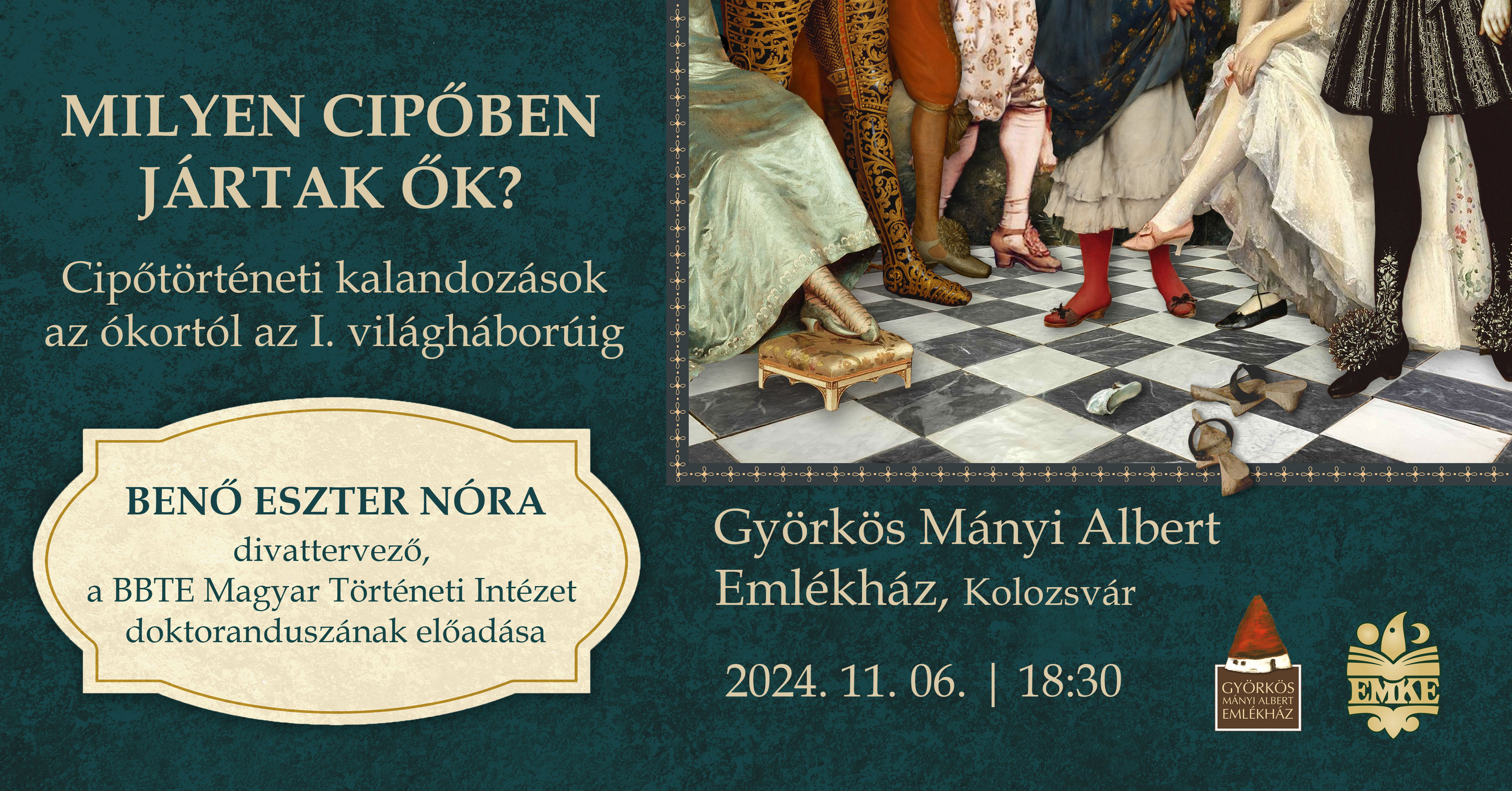 Benő Eszter Nóra divattervező, a BBTE Magyar Történeti Intézet doktorandusza tart vetített képes előadást Milyen cipőben jártak ők? Cipőtörténeti kalandozások az ókortól az I. világháborúig címmel 2024. november 6-án, szerdán, 18:30 órától a Györkös Mányi Albert Emlékházban (Kolozsvár, Republicii / Majális u. 5.)